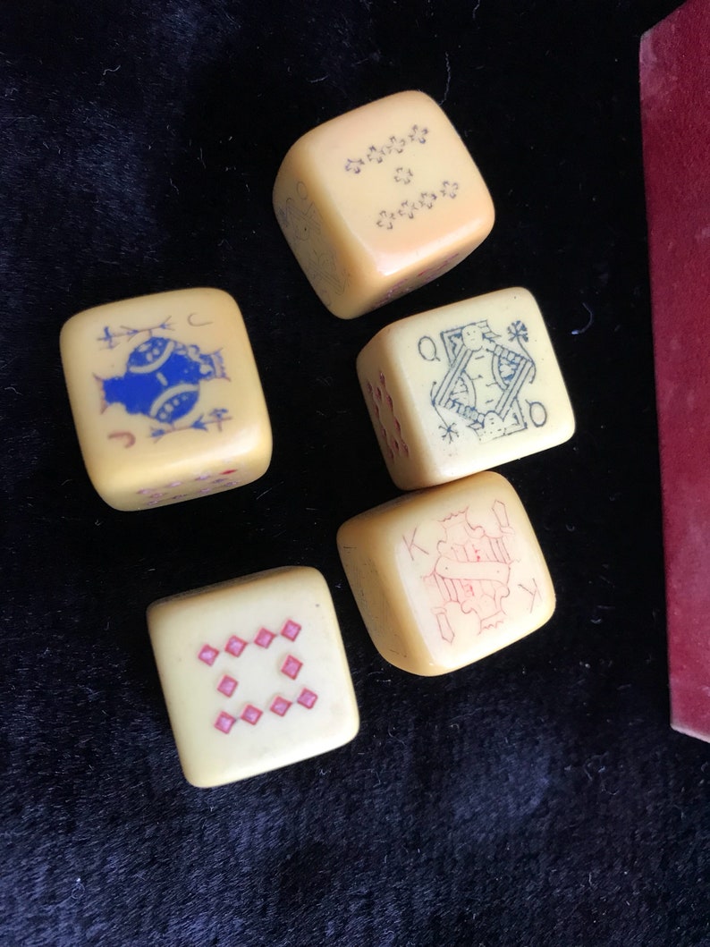 Five Vintage Original Bakelite Poker Dice Set Original Red Box Dexis Iberica Dice Games Toys Games